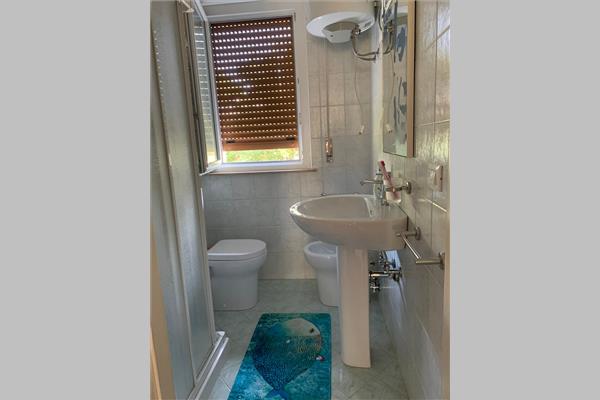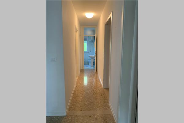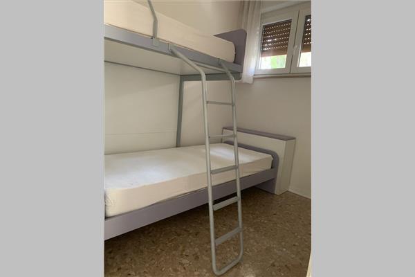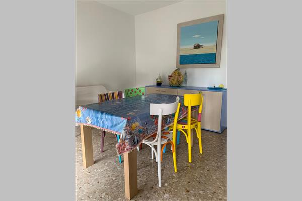 Piano primo senza ascensore si entra dal grande terrazzo abitabile coperto rifinito da tende di nuova installazione , ampio salotto con divano letto e tavolo da pranzo , cucina separata , bagno / lavanderia ;